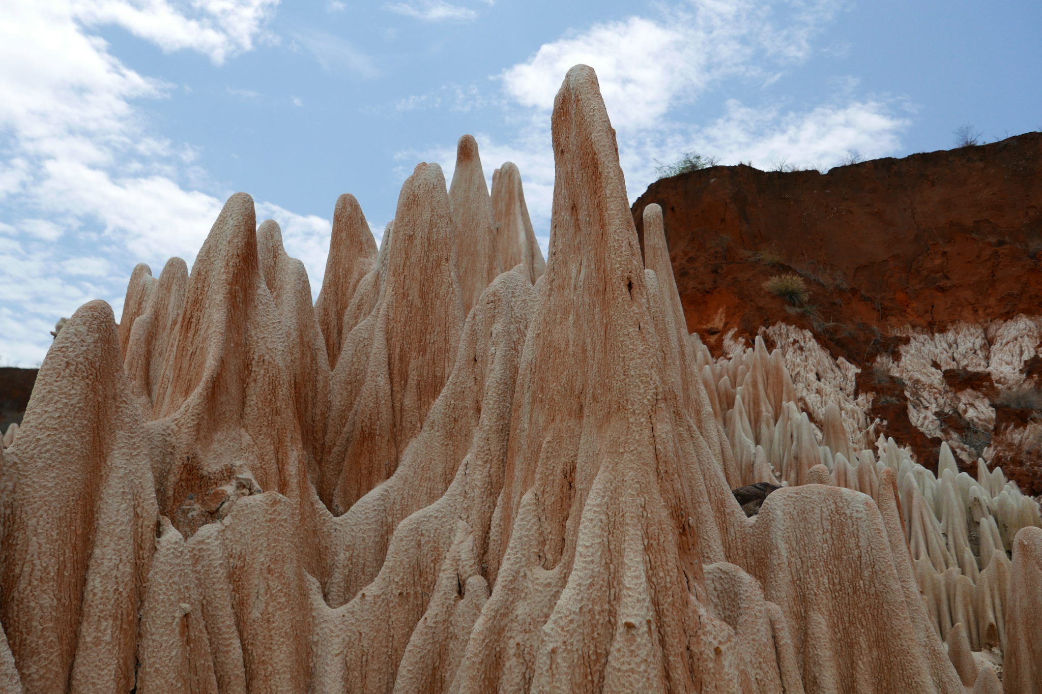 Complètement amoureux des Tsingy, nous reprenons la route vers le nord pour visiter cette fois les Tsingy Rouges à quelques 170 km d’Ankarana. Malgré le même nom, ce ne sont pas du tout les mêmes formations. Celles-ci sont composées en sable, argile et latérite, ce qui les rend très fragile et sensibles à l’eau. Les pluies étant abondantes durant les 6 mois de la saison humide entre novembre et avril, ces formations ne vont pas tenir plus d’une trentaine d’années, et nous sommes vraiment chanceux de les voir en leur état exceptionnel aujourd’hui.